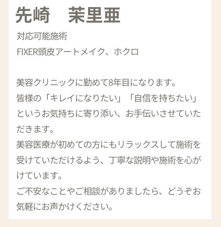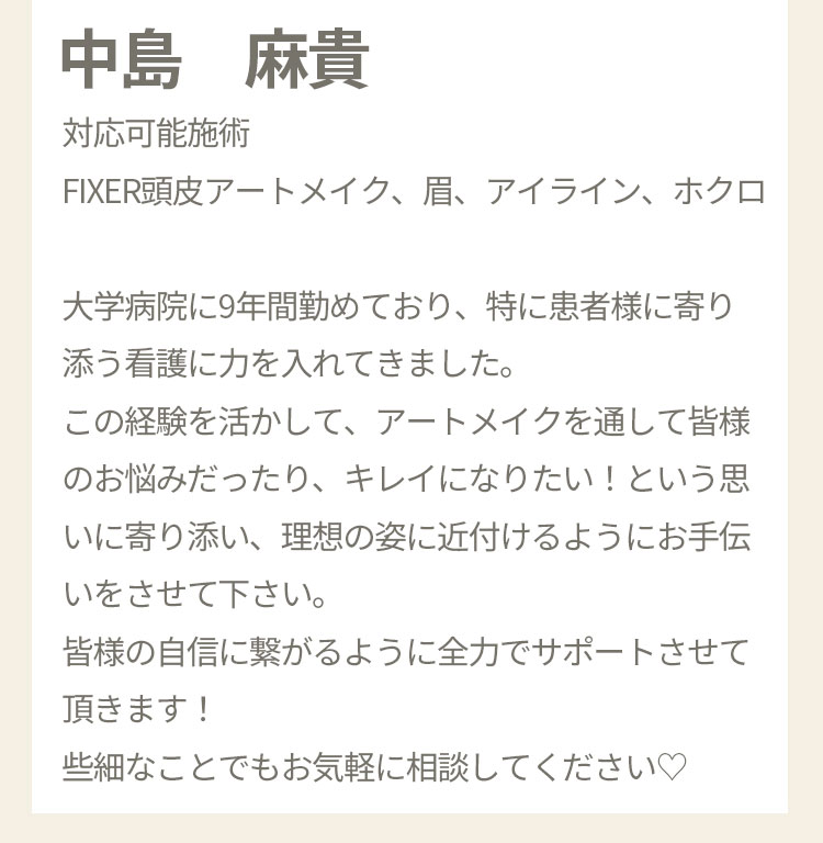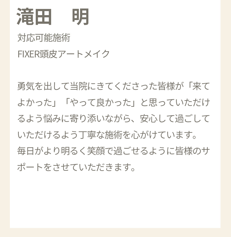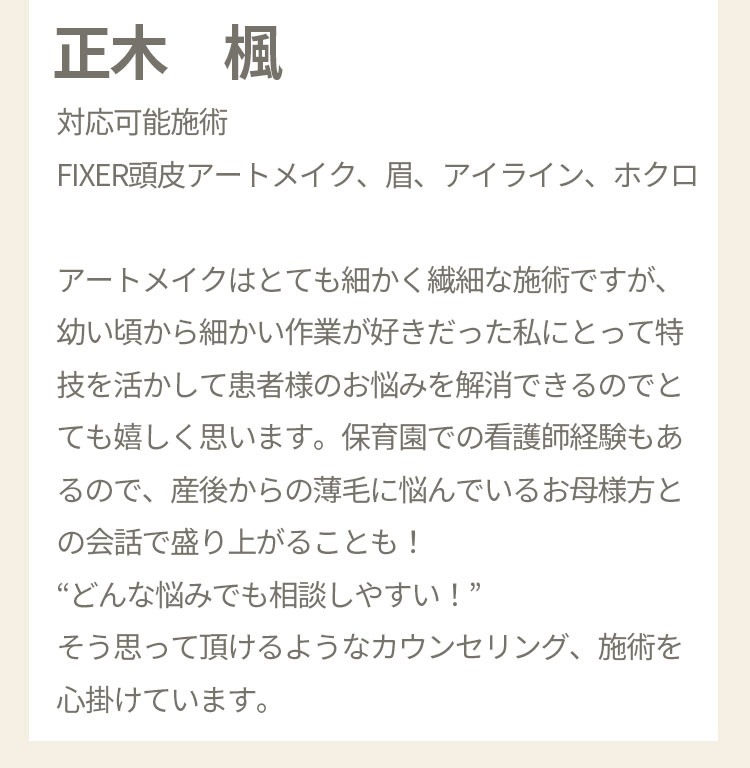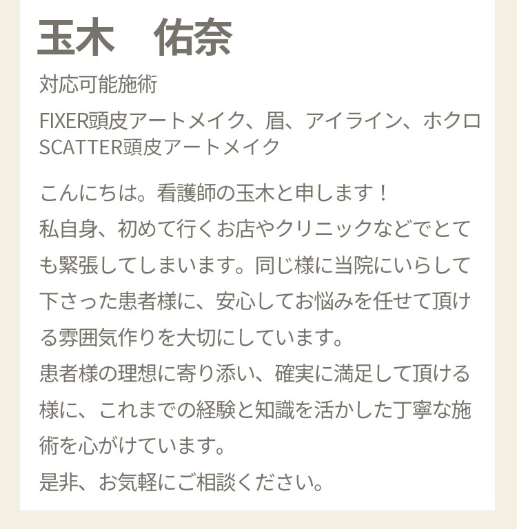 以前ストレスで髪を抜いていたりしてから、あまり生えなくなりました。発毛の治療もいまいち効果が出ず、辞めてしまいました。 それからはスプレーしたり、帽子を被ったりカモフラージュをしていました。 たまたまインスタで頭皮のアートメイクがでてきてやってみたら、毛量が増えたかのようにカモフラージュされて、スプレーもせず外出できます。 施術もゲームをしていたらすぐ終わりました。 ありがとうございます。